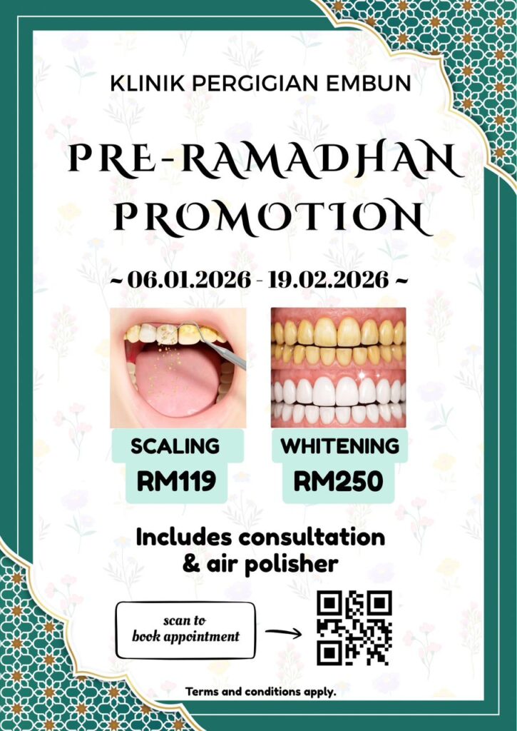 Posted on zaroul hisham Easy and fastPosted on Tyka Mohamad Suasana klinik yang tenang dan proses scaling yang sangat mudah dan lancar. Harga pun berpatutanPosted on Muhammad Elyas Mohd Shah best! sangat friendlyPosted on Mohamad Izzuwani Ranlan Rose Perkhidmatan yang disediakan baik dan profesional. Memberi khidmat nasihat sebelum rawatan. Staff yang baik. Harga yang berpatutan.Posted on izzati hanisah Did my scaling & filling today. The scaling is so thorough, I love it ❤️ Great Job. Kudos to the Dr & staff Will come again insyaAllah 😊Posted on sitiarfah abu bakar Alhamdulillah terima kasih Doktor dan Team staf klinik gigi Embun. Perkhidmatan terbaik , ruang dalaman klinik yang kondusif dan harga sangat berpatutan. Semoga terus maju jaya🌹